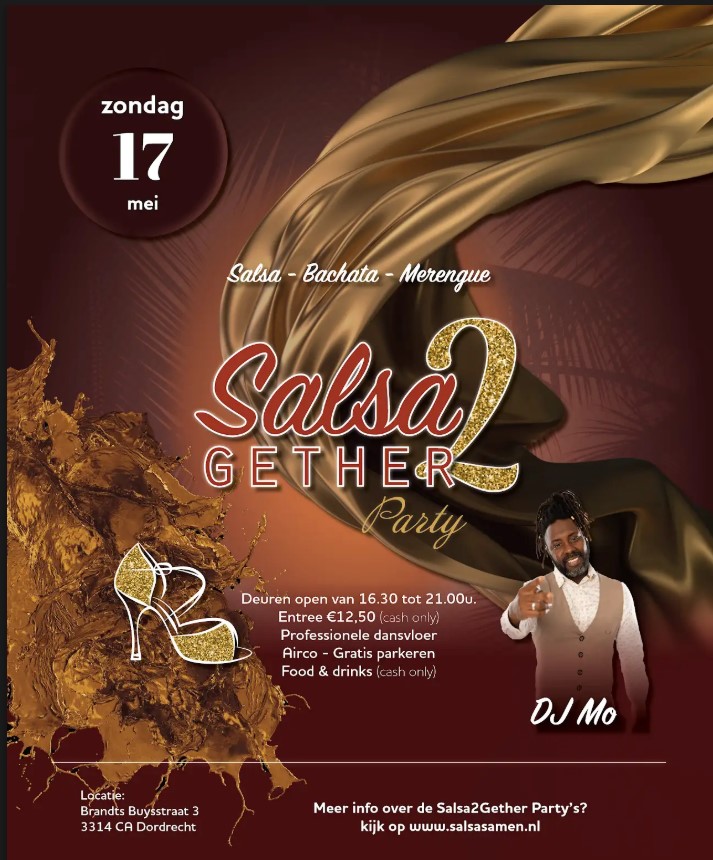 - Regelmatig Salsa2Gether Party’s dichtbij huis in Dordrecht die laagdrempelig zijn en waar iedereen met iedereen danst